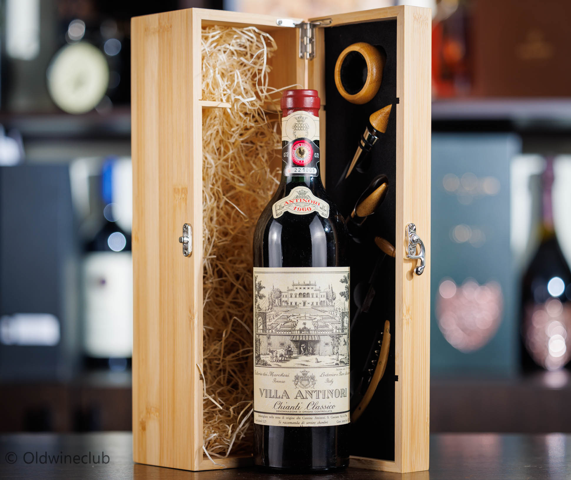 Знаменитое красное сухое вино Chianti Classico Villa Antinori 1960 года урожая из региона Тоскана, Италия. Предлагается в красивой подарочной коробке с винными аксессуарами.