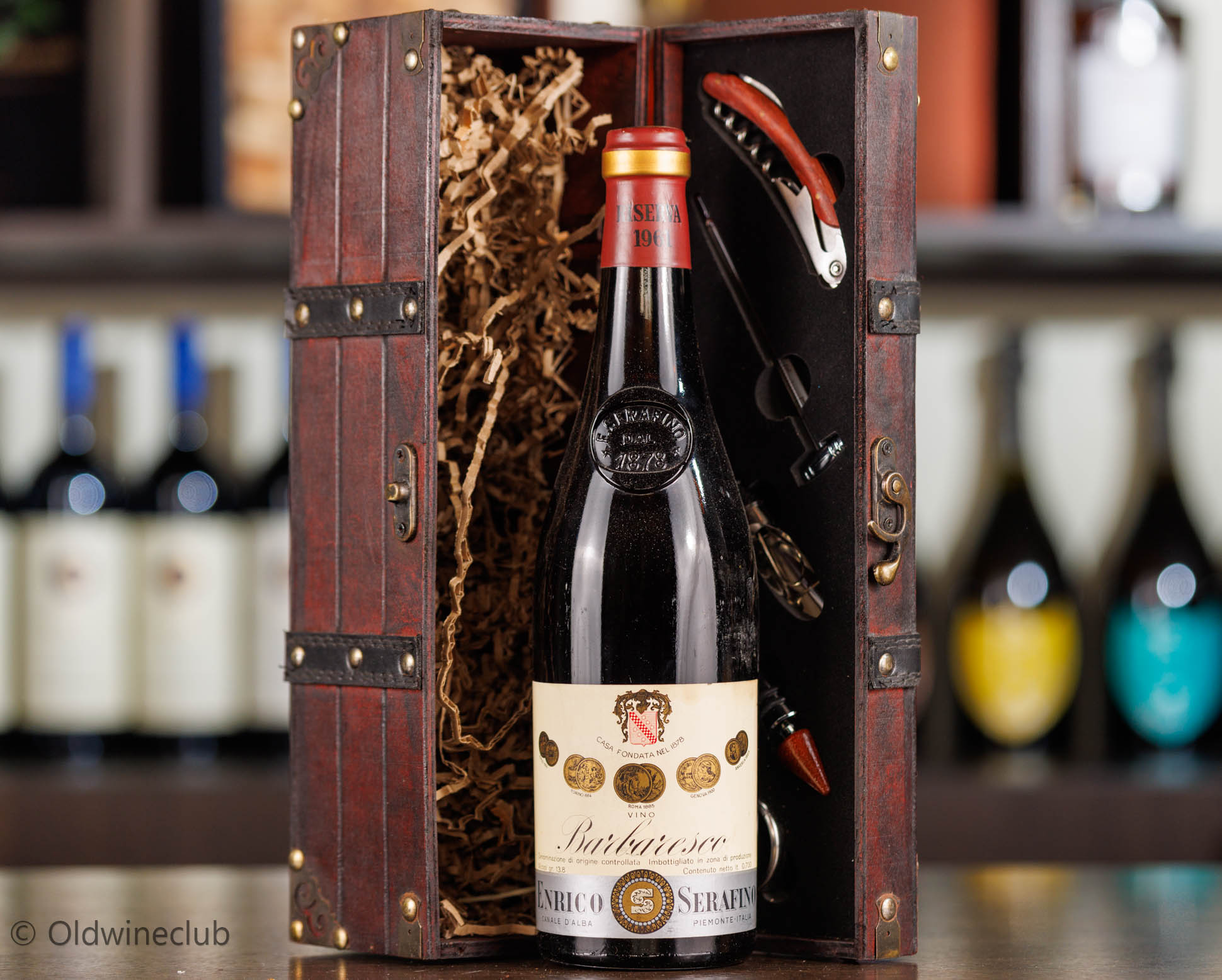 Бутылка предлагается в деревянном подарочном коробе с аксессуарами для вина.
