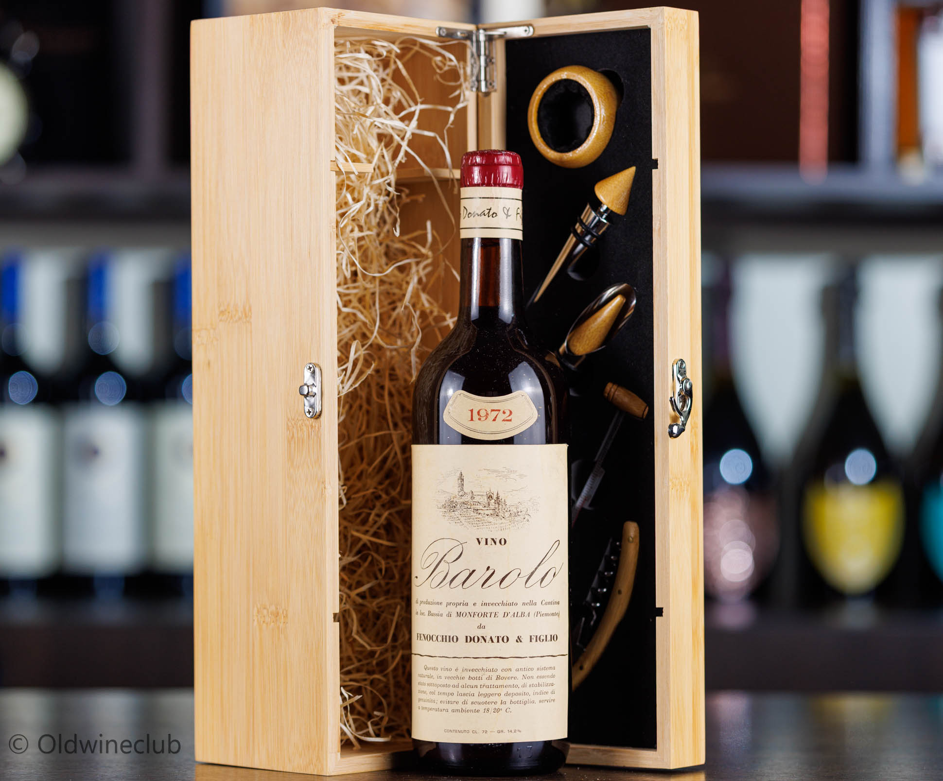 Бутылка предлагается в подарочном деревянном ящике с набором элитных аксессуаров для вина.