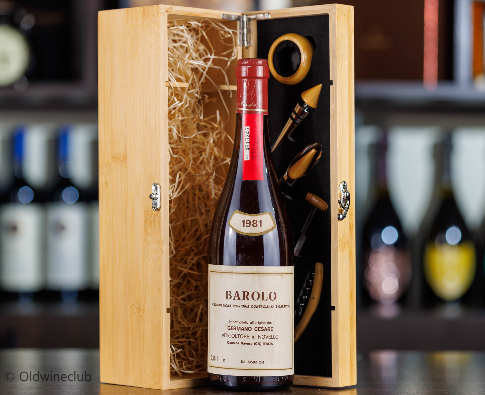 Бутылка предлагается в подарочном деревянном ящике с набором элитных аксессуаров для вина.