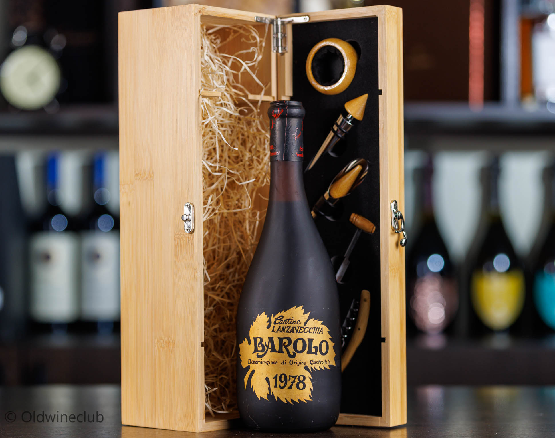 Бутылка предлагается в подарочном деревянном ящике с набором элитных аксессуаров для вина.