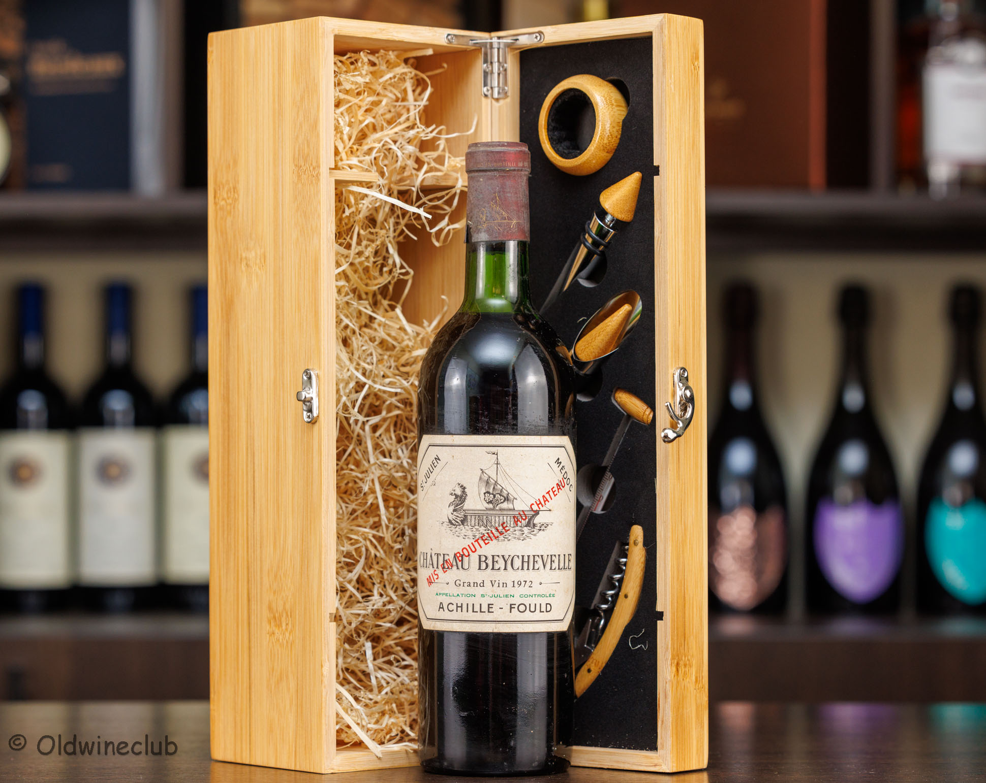 Бутылка предлагается в деревянном подарочном коробе с аксессуарами для вина.