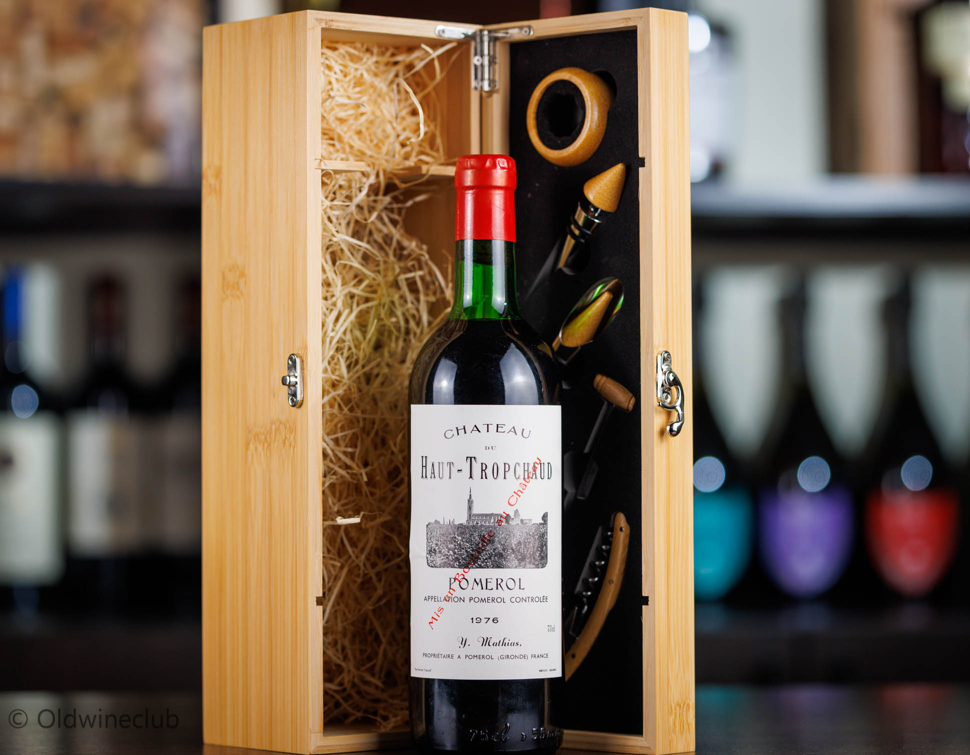 Бутылка предлагается в деревянном подарочном коробе с аксессуарами для вина.