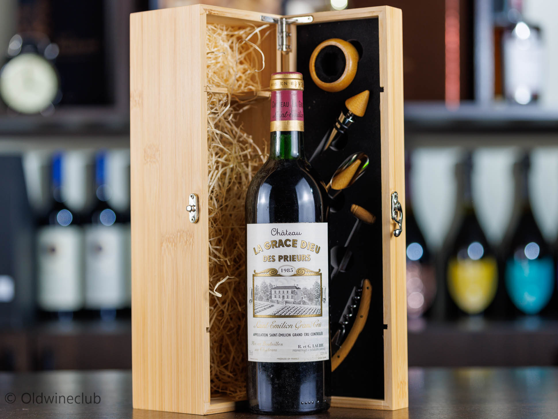 Бутылка предлагается в подарочном деревянном ящике с элитными винными аксессуарами.