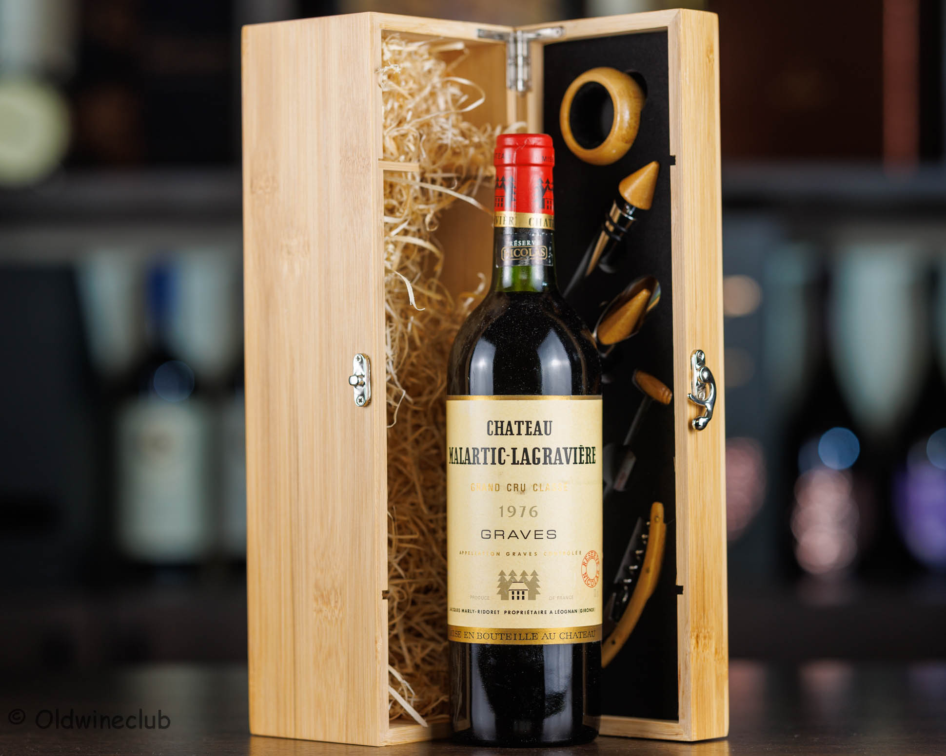 Бутылка предлагается в деревянном подарочном коробе с аксессуарами для вина.