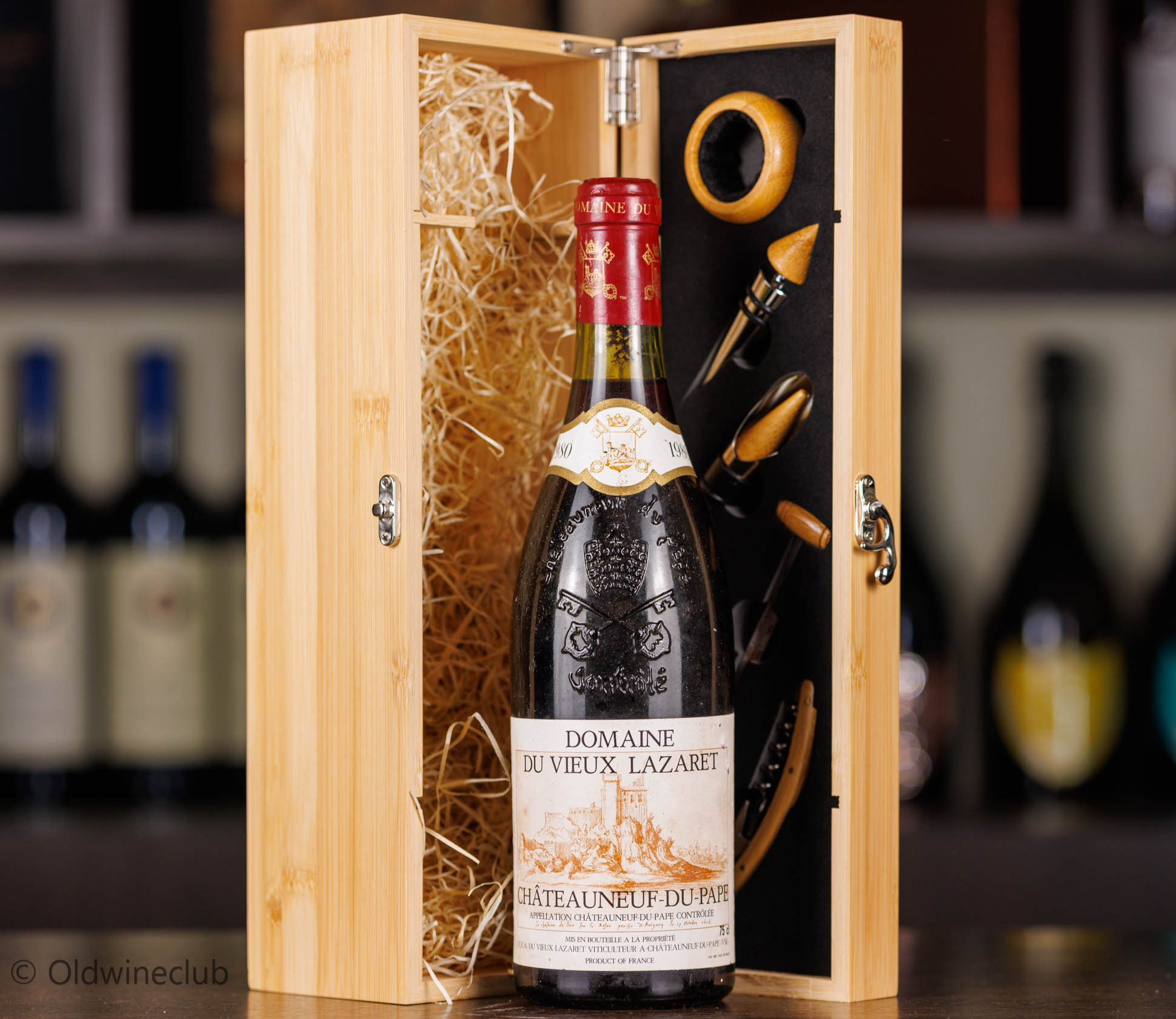 Бутылка предлагается в деревянном подарочном коробе с аксессуарами для вина.