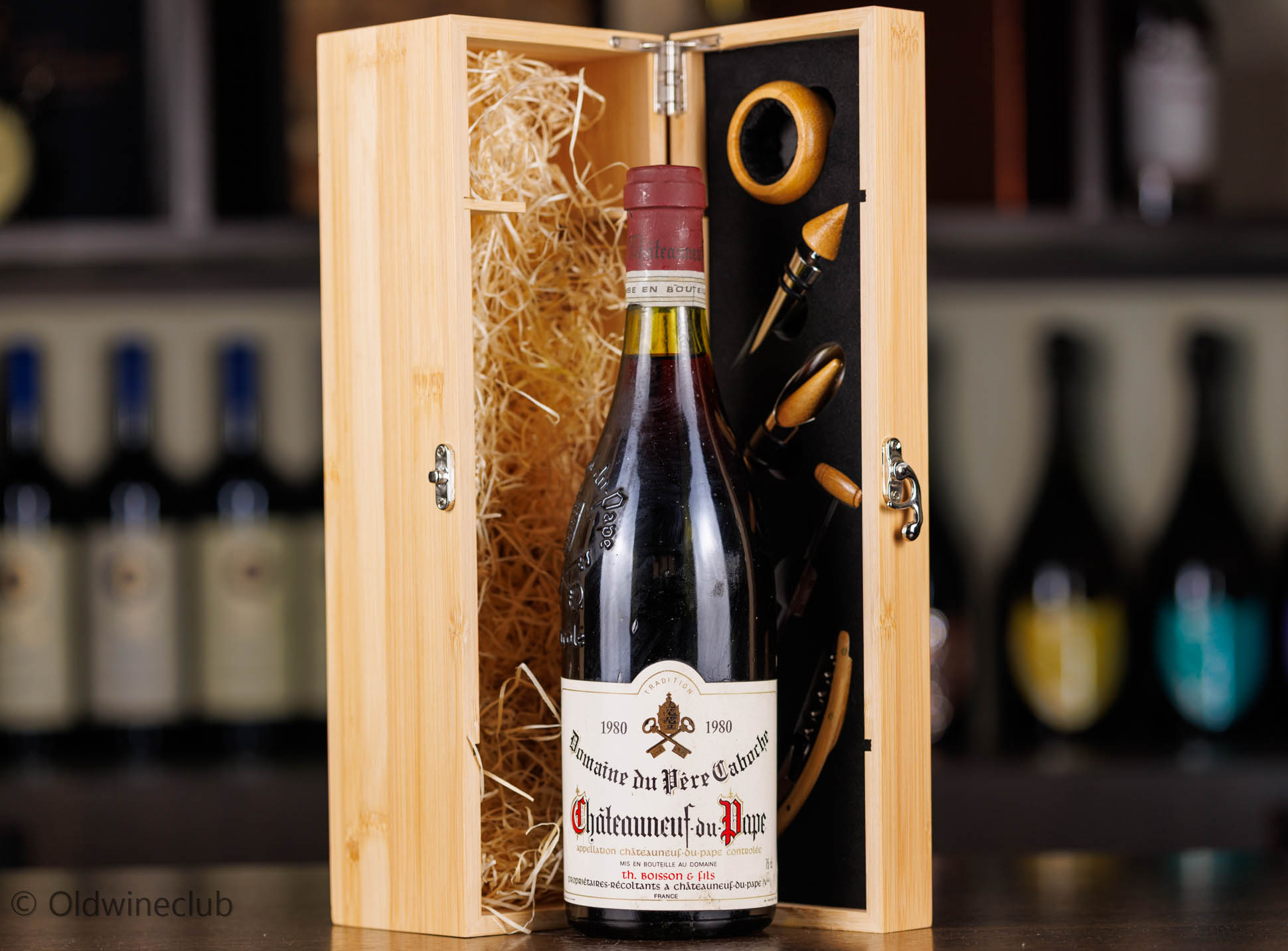 Бутылка предлагается в деревянном подарочном коробе с аксессуарами для вина.