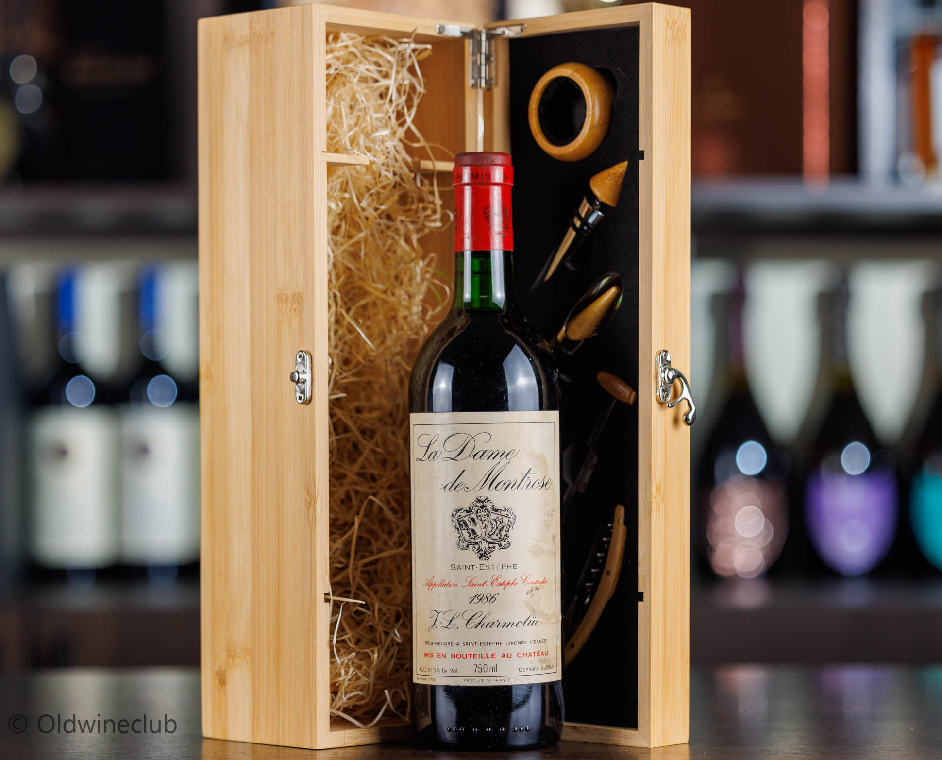 Бутылка предлагается в деревянном подарочном коробе с аксессуарами для вина.