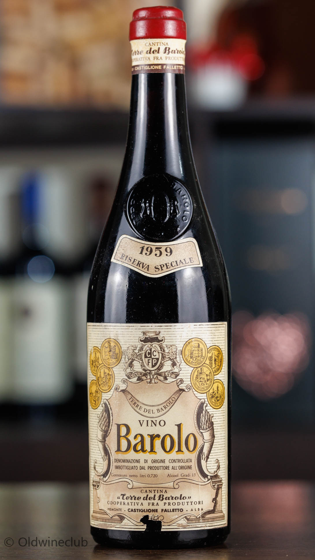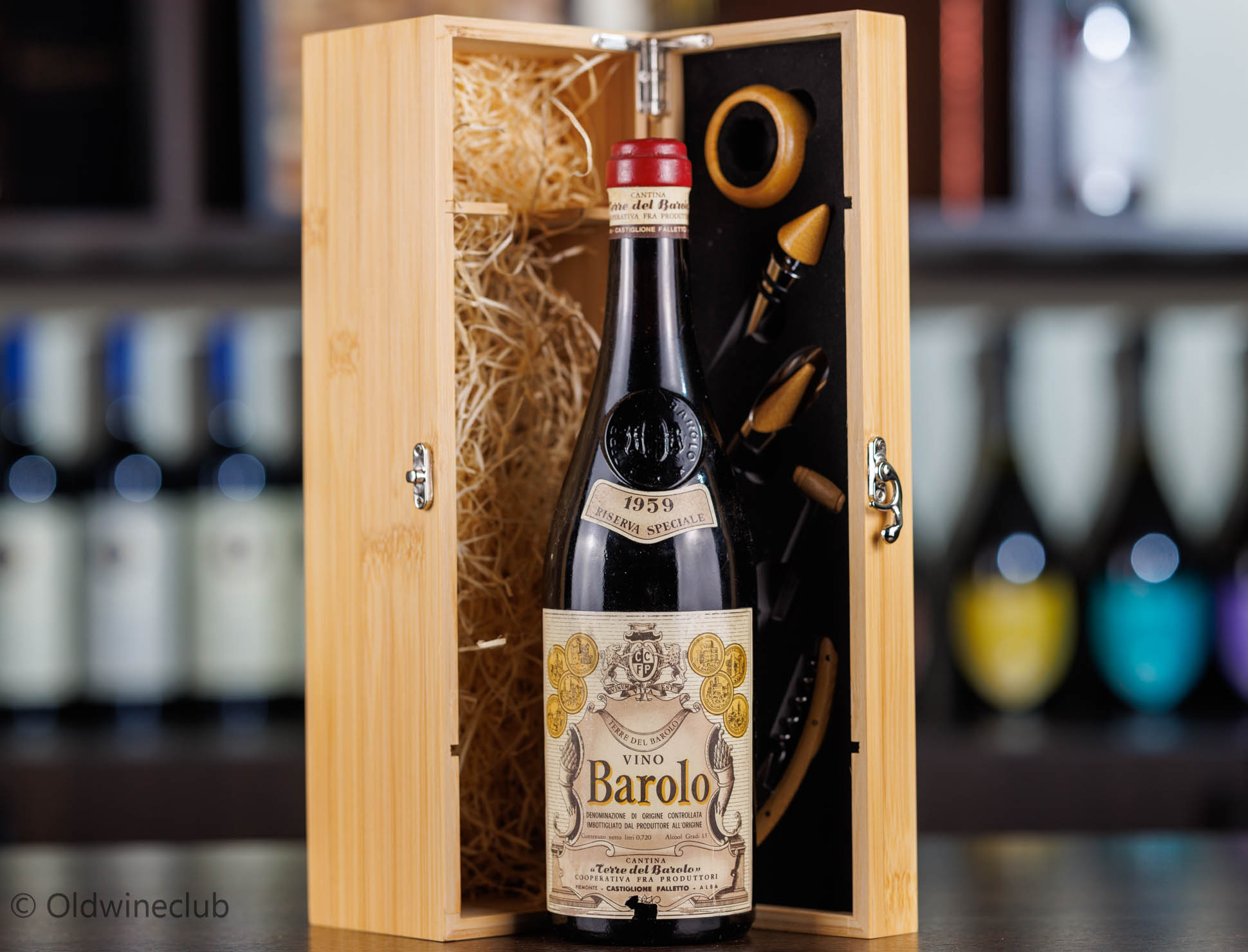 Красное сухое вино Barolo Riserva от винодельческого хозяйства Terre del Barolo 1959 года из Италии, регион Пьемонт. Предлагается в деревянной подарочной коробке.