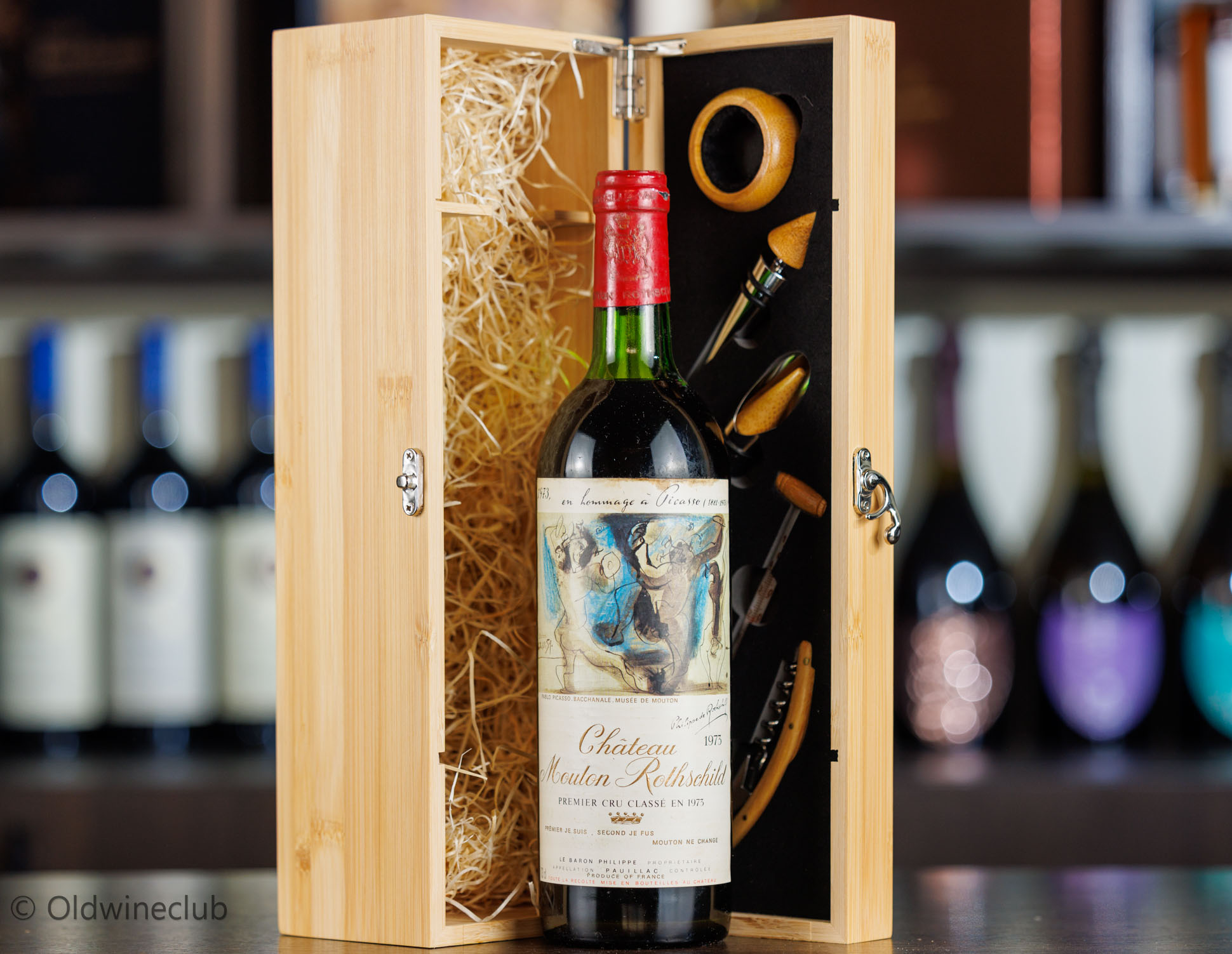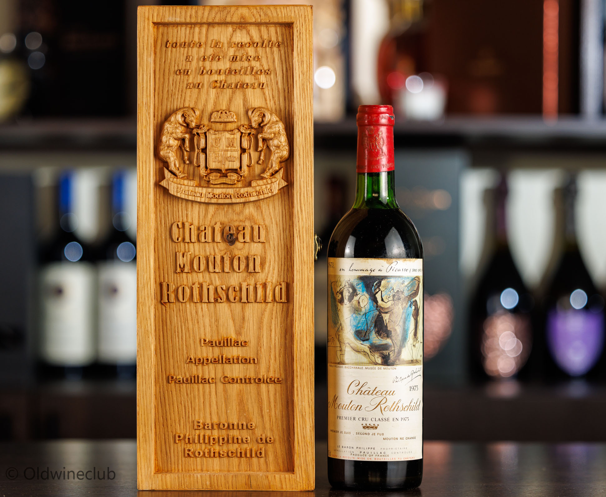 Культовое красное сухое вино Chateau Mouton Rothschild 1973 года, регион Bordeaux, аппелласьон Pauillac, Франция. Входит в пятерку великих бордосских вин Франции и имеет одно знаковое отличие от других своих конкурентов - для каждого винтажа приглашается знаменитость для создания этикетки. Причем, это не обязательно должен быть профессиональный художник, но всегда знаковая фигура, как минимум, для самого семейства Ротшильдов.