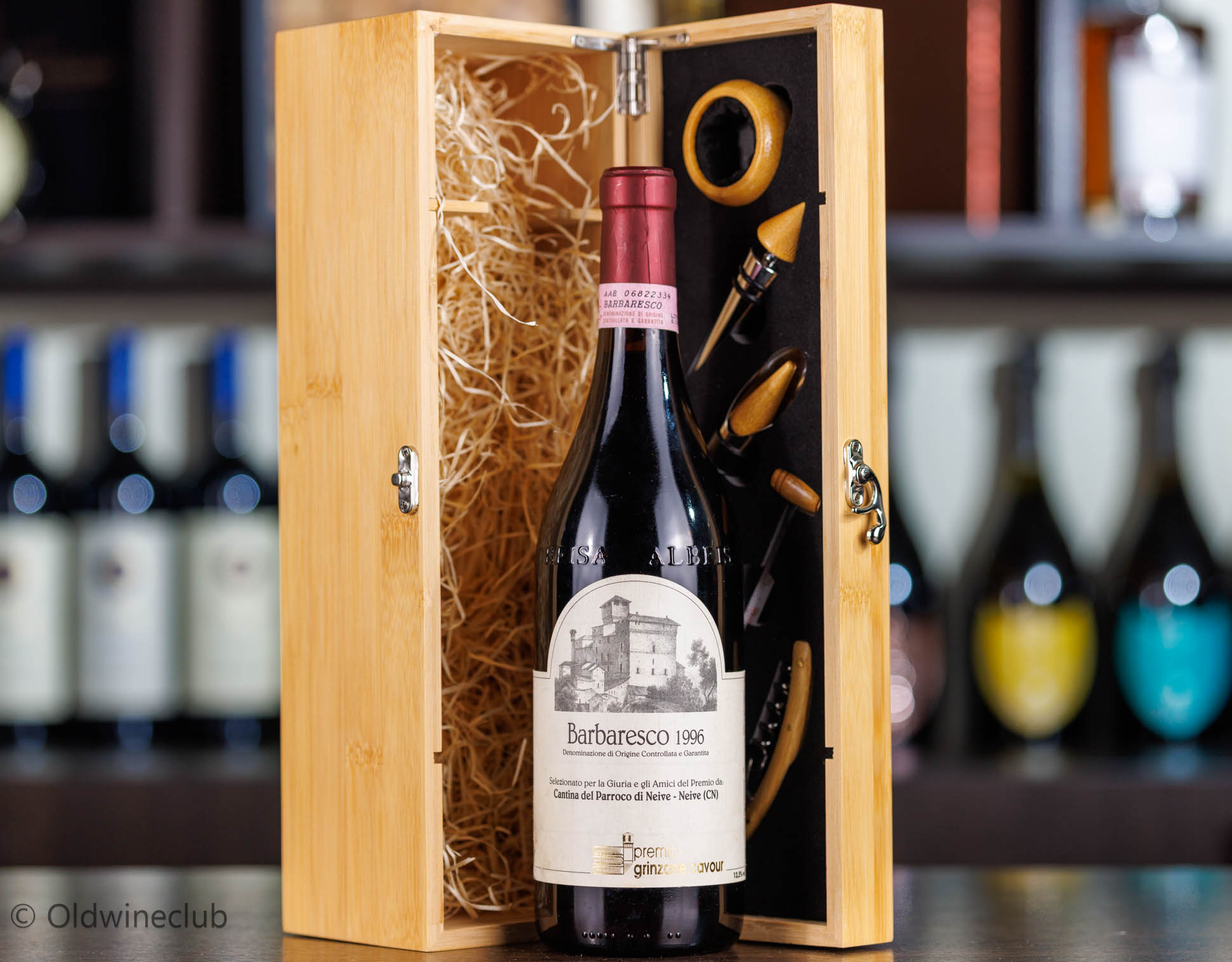 Бутылка предлагается в подарочном деревянном ящике с набором элитных аксессуаров для вина.