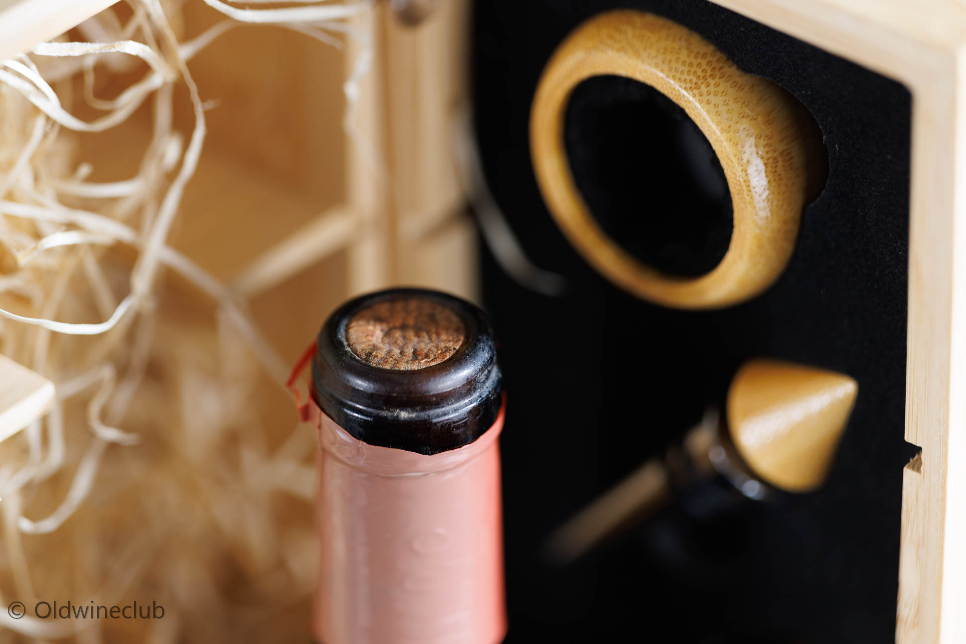 Бутылка предлагается в подарочном деревянном ящике с набором элитных аксессуаров для вина.