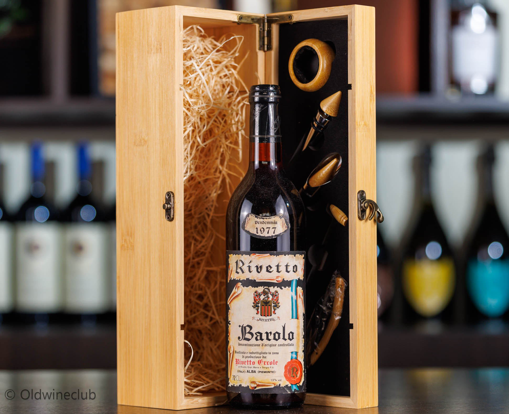 Бутылка предлагается в деревянном подарочном коробе с аксессуарами для вина.