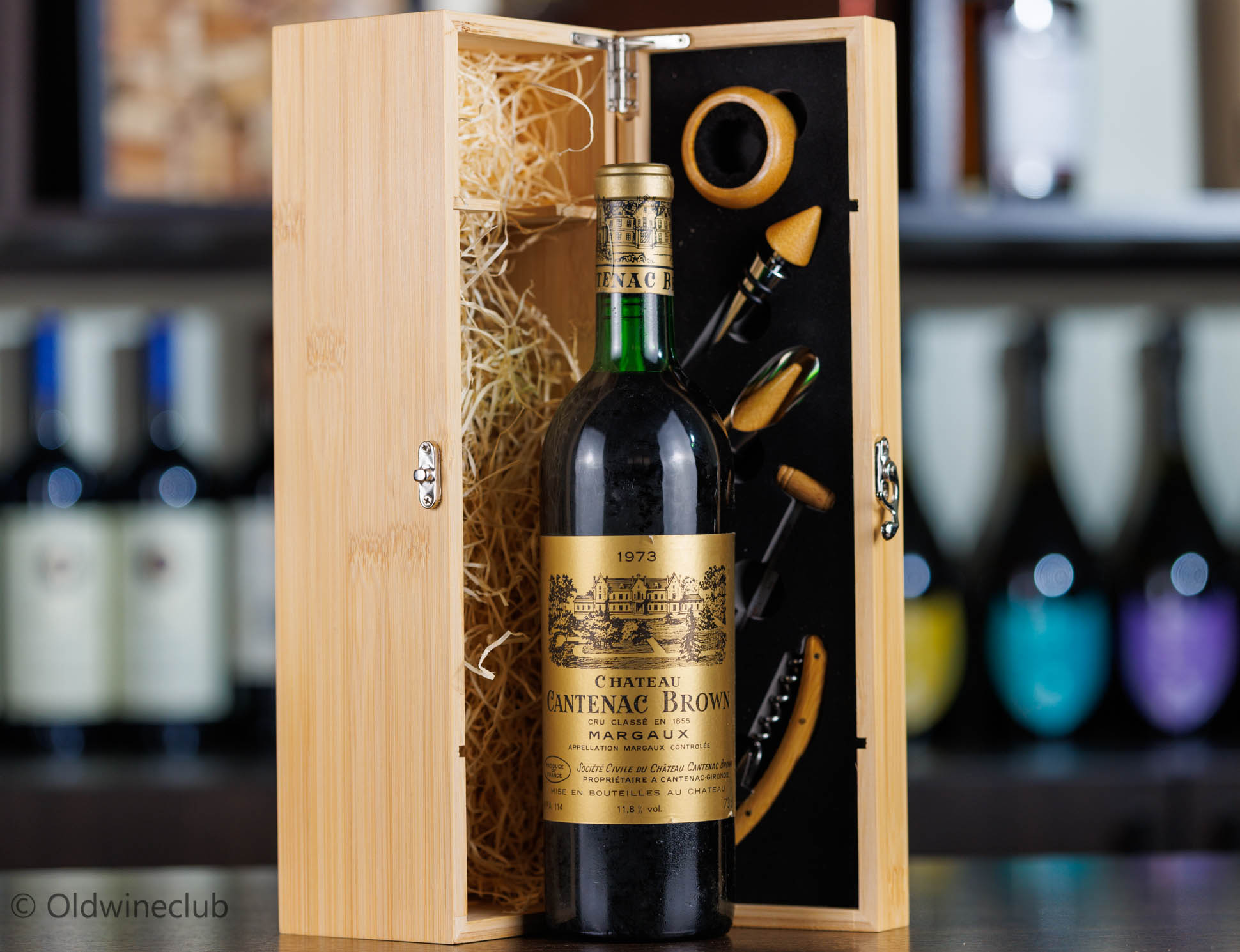 Бутылка продается в подарочном деревянном ящике с элитными винными аксессуарами.