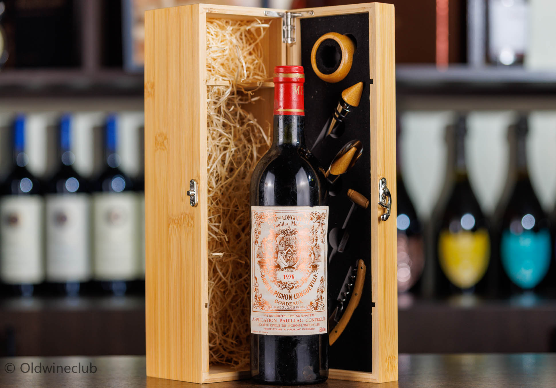 Бутылка предлагается в подарочном деревянном ящике с элитными винными аксессуарами.