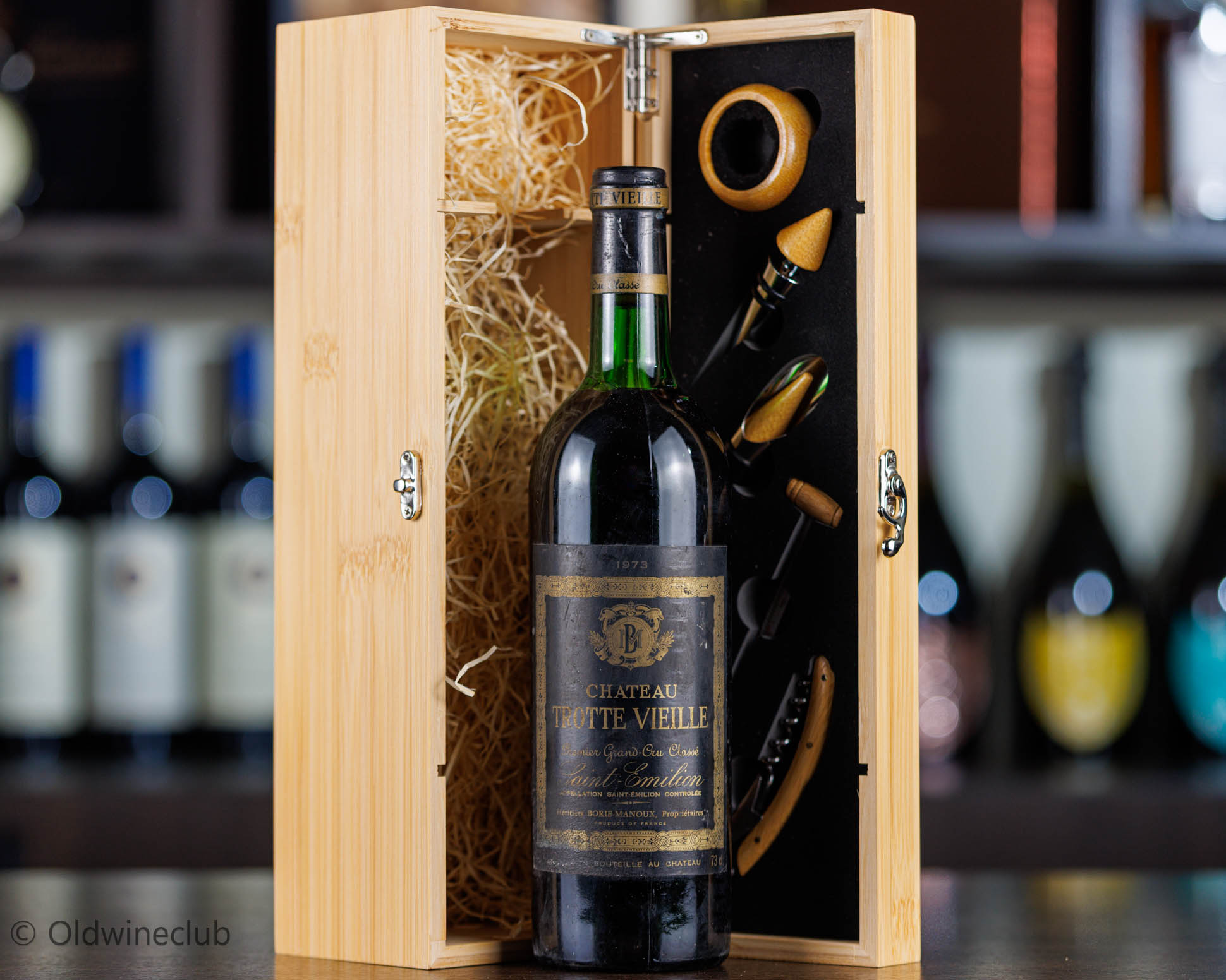 Бутылка продается в подарочном деревянном ящике с элитными винными аксессуарами.