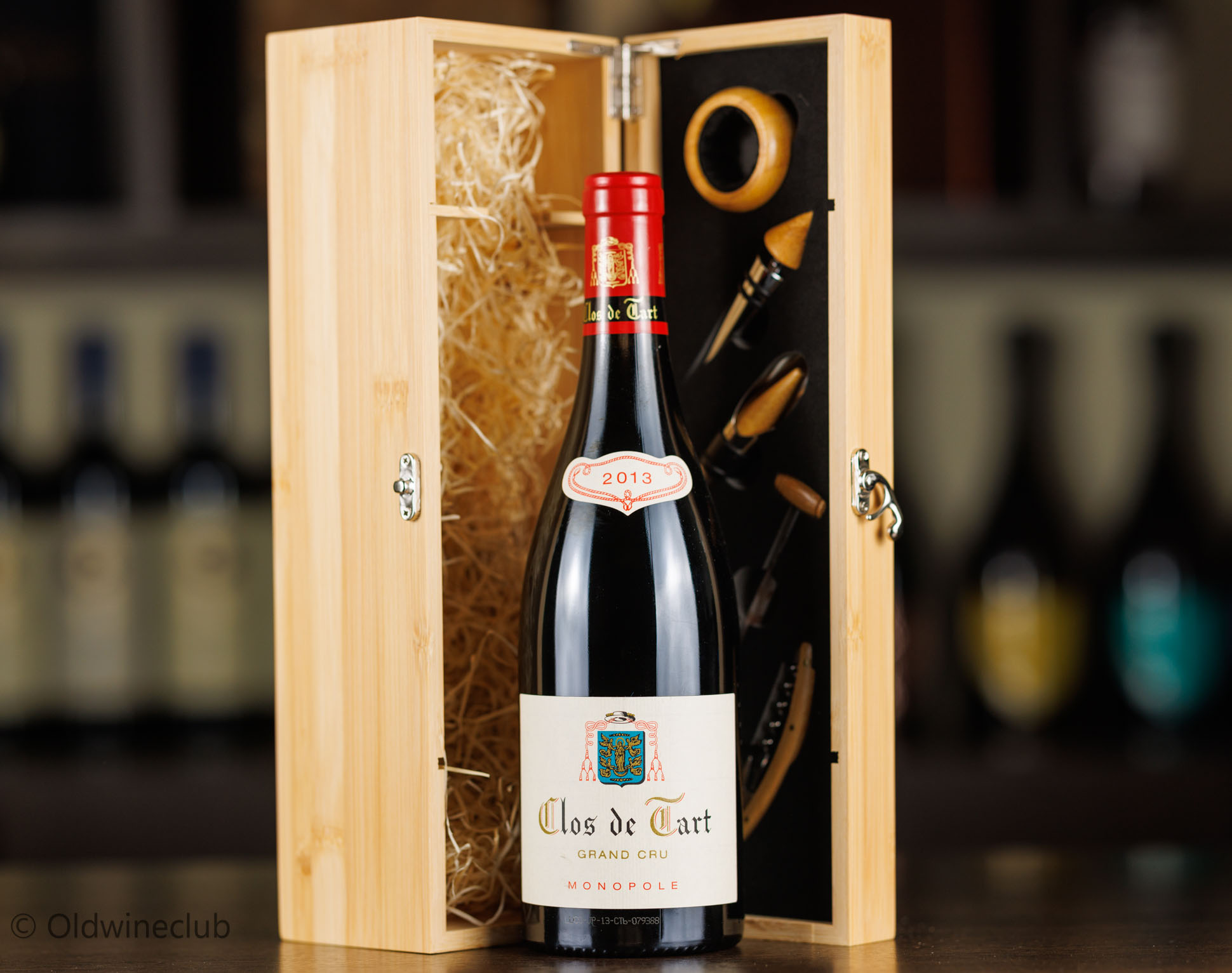 Бутылка предлагается в деревянном подарочном коробе с аксессуарами для вина.