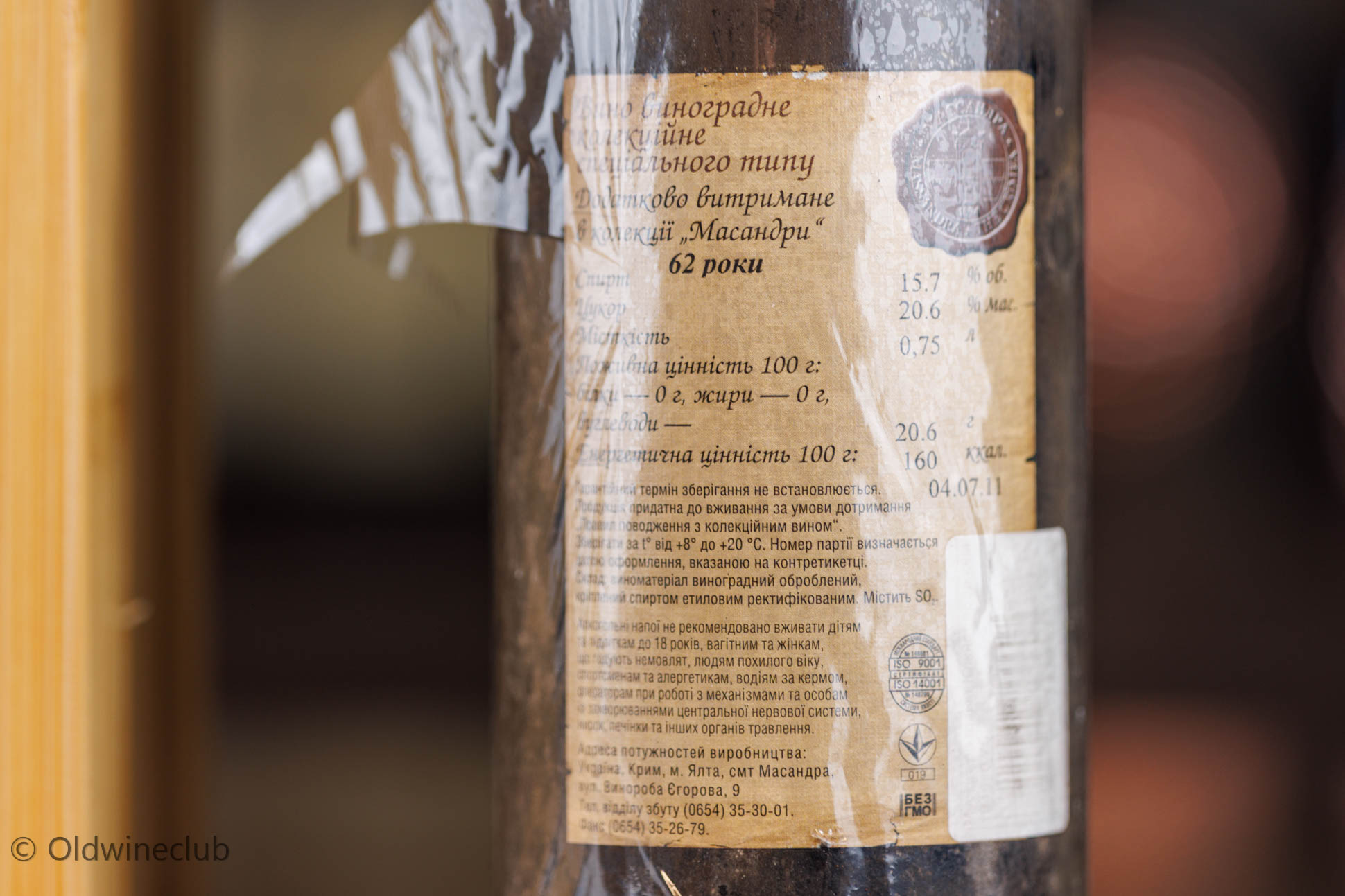 После отделения сусла-самотека и легкого прессования мезги начиналось брожение, которое затем останавливали добавлением спирта-ректификата для сохранения природной сладости. Далее вино выдерживалось по классической технологии в бочках из кавказского дуба не менее двух лет, приобретая свой неповторимый органолептический профиль. Завершающим этапом стала уникальная 62-летняя бутылочная выдержка в покое в подвалах Массандры.